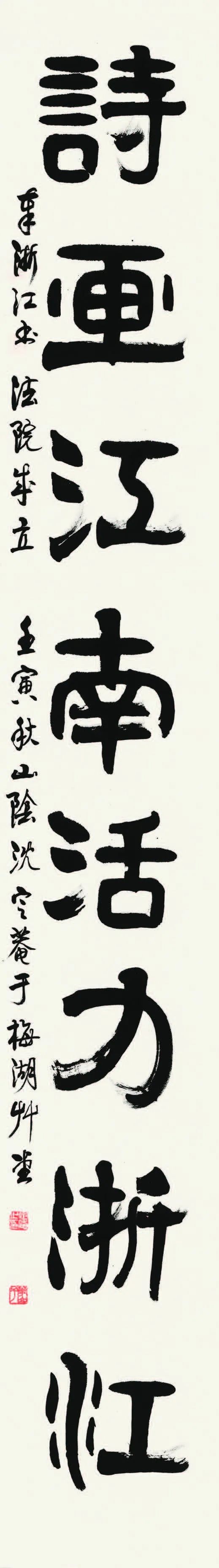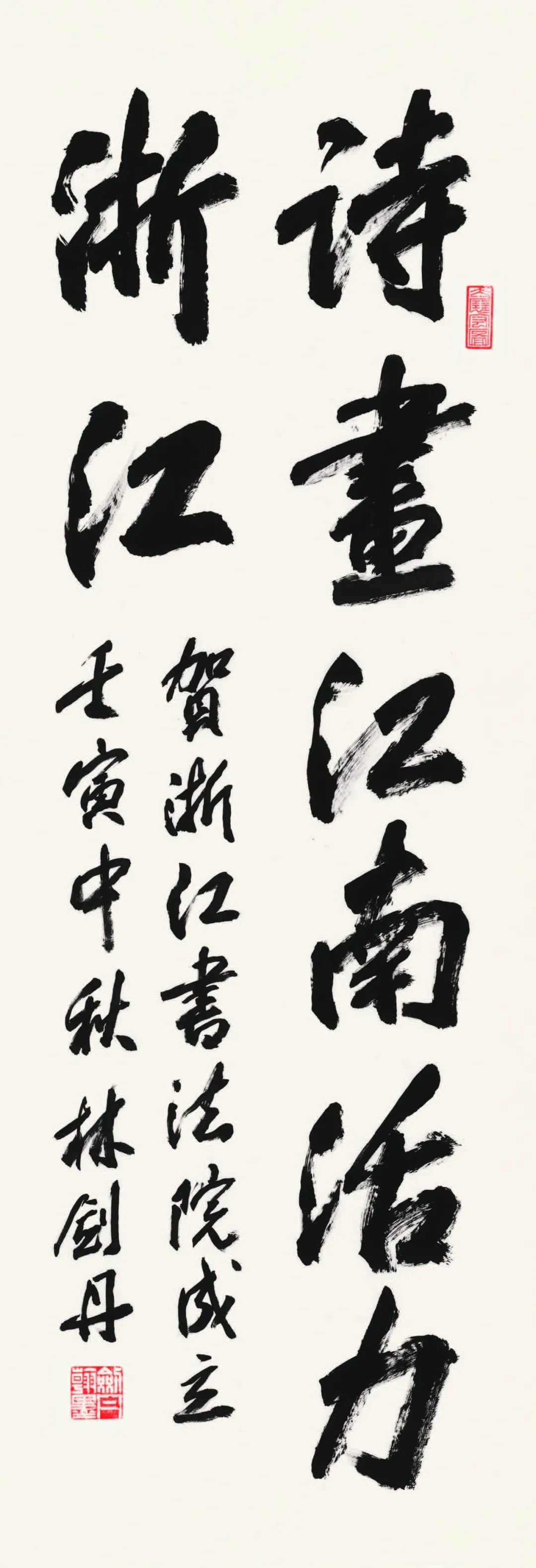 在浙江书法院正式揭牌之际,还特别举办了“诗画江南 活力浙江”——浙江书法院成立特展。此次展览共展出作品154件,邀请中国书协主席孙晓云和73位浙江(含浙江籍)书法篆刻名家围绕“诗画江南 活力浙江”主题创作了143件作品,另有特邀作品11件。参展艺术家涵盖了浙江省老中青三代书法名家,其中80岁以上老书家10人,60至80岁书家近40人,60岁以下中青年书家近30人。